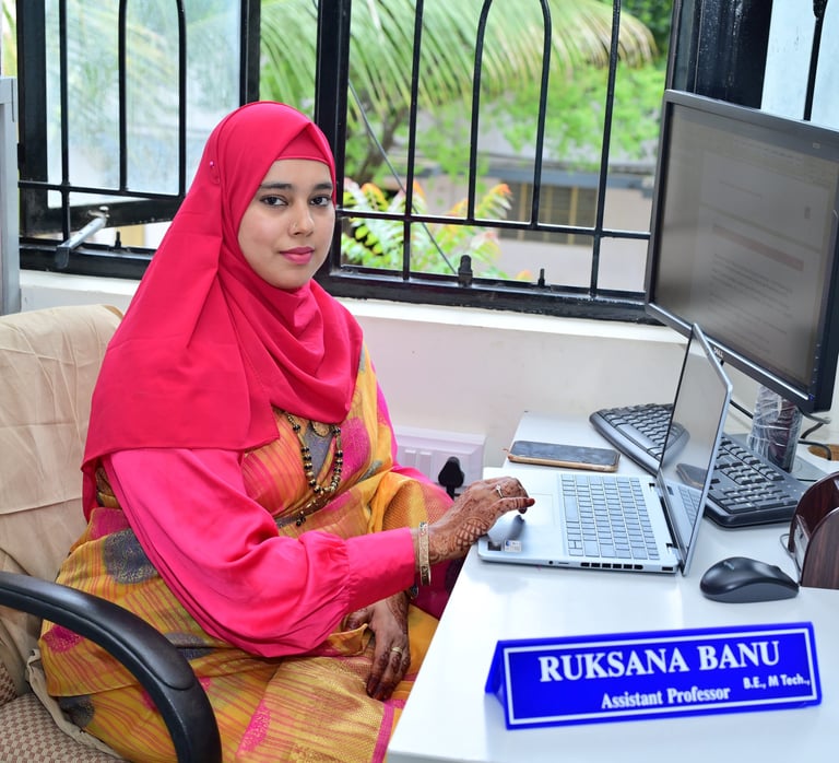 Mrs. RUKSANA BANU is an Assistant Professor in the Department of Computer Science & Engineering with an M.Tech in CS&E. With over 5 years of teaching experience. Mrs. RUKSANA BANU has published research paper in reputed journals. She have been enrolled as a Member of The Institution of Engineers (India) and placed in COMPUTER ENGINEERING Division. She aspires to utilize her extensive teaching expertise and passion for knowledge to foster academic excellence. By engaging in innovative research and embracing emerging technologies, she aims to contribute significantly to the field of Computer Science & Engineering. Additionally, she is deeply committed to active community engagement, striving to inspire and empower the next generation of learners and researchers. Through her dedication to both teaching and research, she envisions making a lasting impact in academia and beyond.